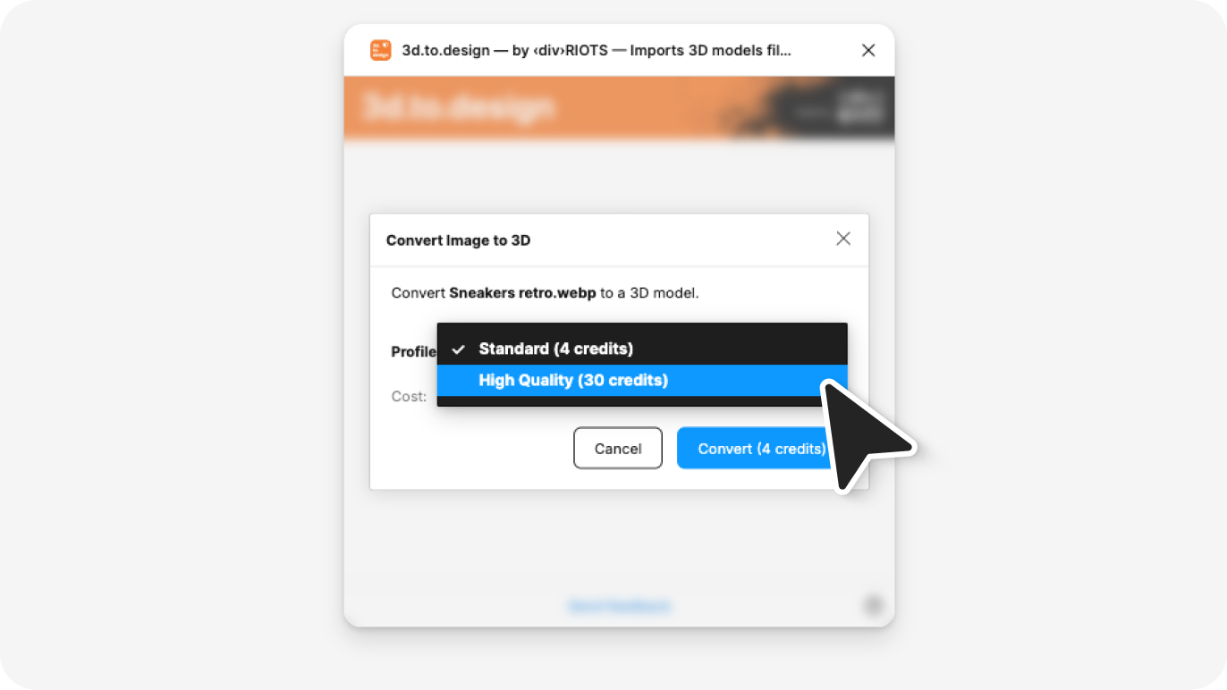 3d.to.design changes that workflow. The plugin already lets you import native 3D model files (.glTF, .glb, .obj) directly into Figma and rotate them on the canvas. Its new AI feature goes one step further: drop in any flat image — a product photo, a logo, an icon — and the plugin's AI generates a full 3D version of it that you can rotate freely, right inside Figma.