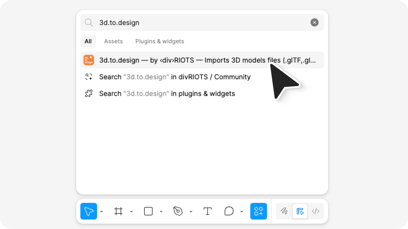 Open Figma, go to the Plugins menu (or press Cmd + P and search for "3d.to.design"), and find 3d.to.design. Click Run to open the plugin panel. The plugin is free and available directly from the Figma Community.